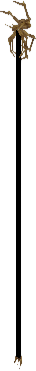 This staff is long, thin and smartly polished, its gnarled set wood with a spider orniment on top. The orniment is held tightly to the tip by gold prongs.