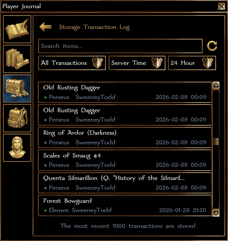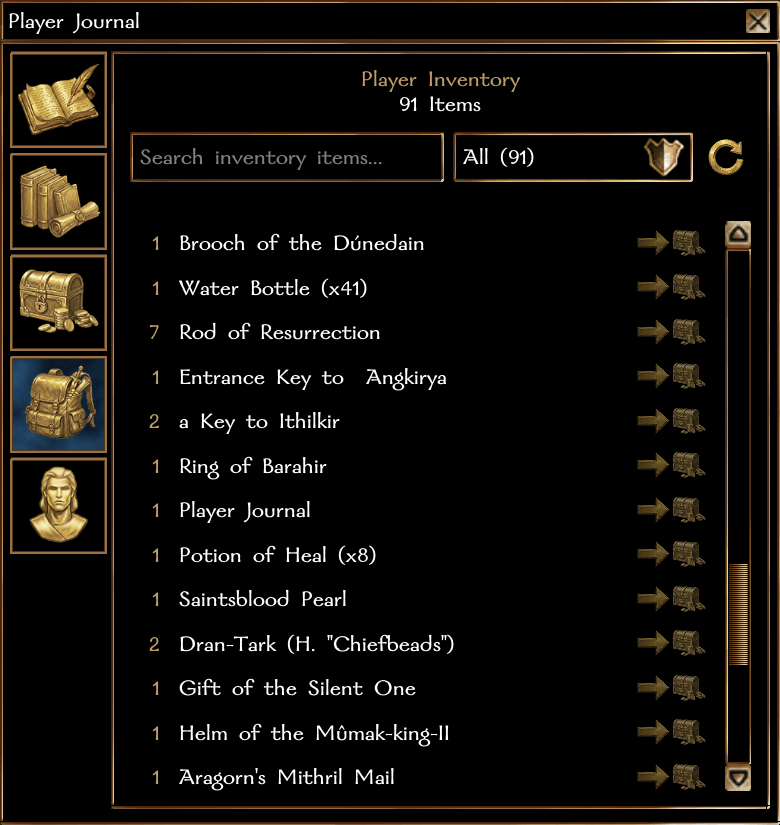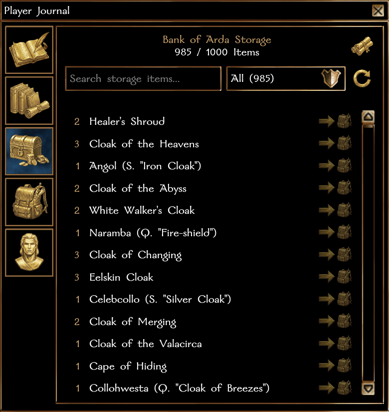 - While your Bank of Arda storage is open, you can use the Player Journal to quickly transfer items between your character inventory and bank storage.