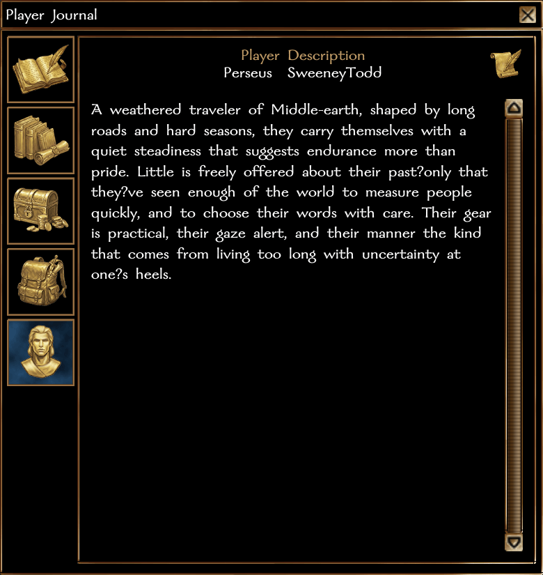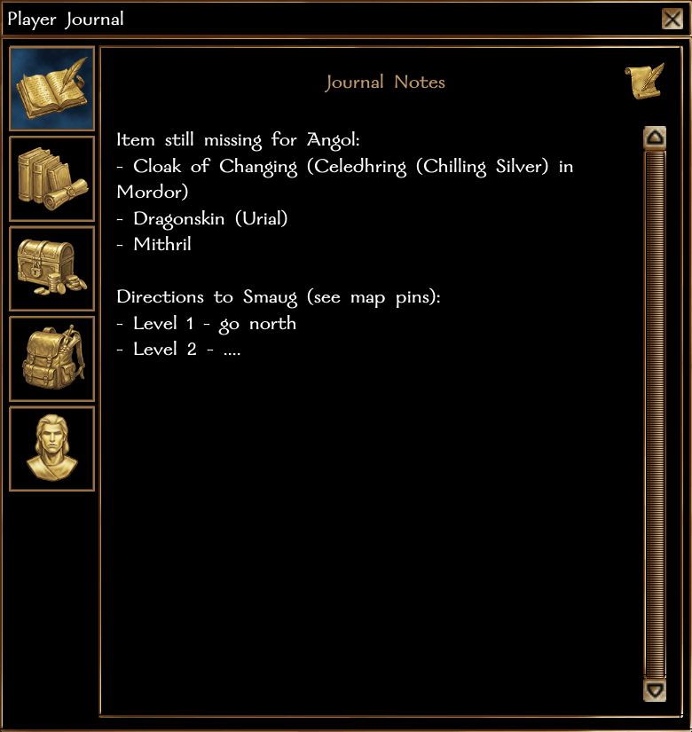 Player Journals are a unique item automatically granted to every character. The journal features a custom interface to view and manage journal notes, area lore discoveries, Bank of Arda persistent storage, and your current character's inventory & description.