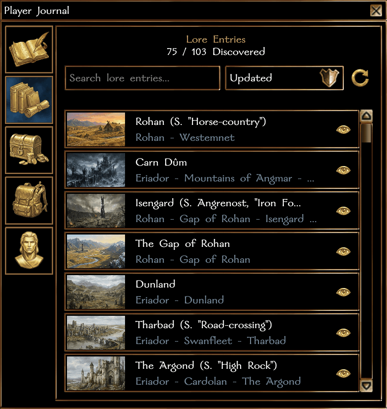 View, search, sort, and filter through discovered area lore that you unlock while exploring new areas.