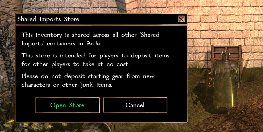 Shared Imports is a community item-sharing container in the form of a Merchant. Players can deposit items for others to take at no cost. One is located at most bindstones in Arda.