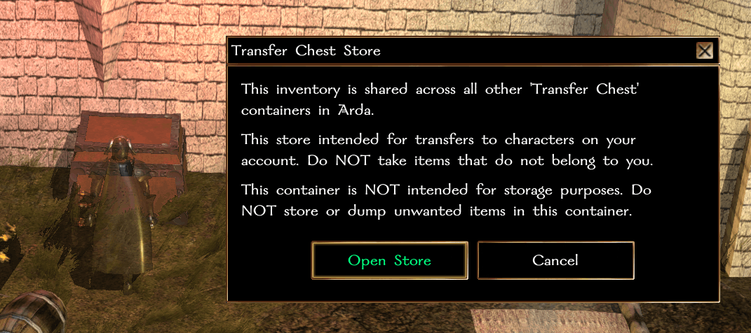 The Transfer Chest is a shared persistent container for moving items between your own characters in the form of a Merchant. One is located at most bindstones in Arda.